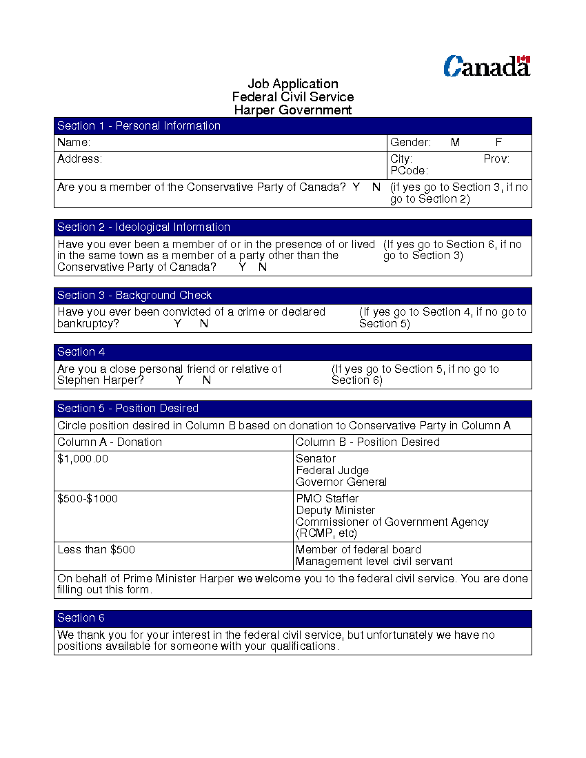 Given the press that Harper is generating the past couple of weeks, with criminals as advisors and kicking out people from rallies for being, shall we say, not ideologically pure, here is a sample of a Federal government job application should Harper win his vaunted majority. Click on the image to enlarge or here for a more readable PDF.