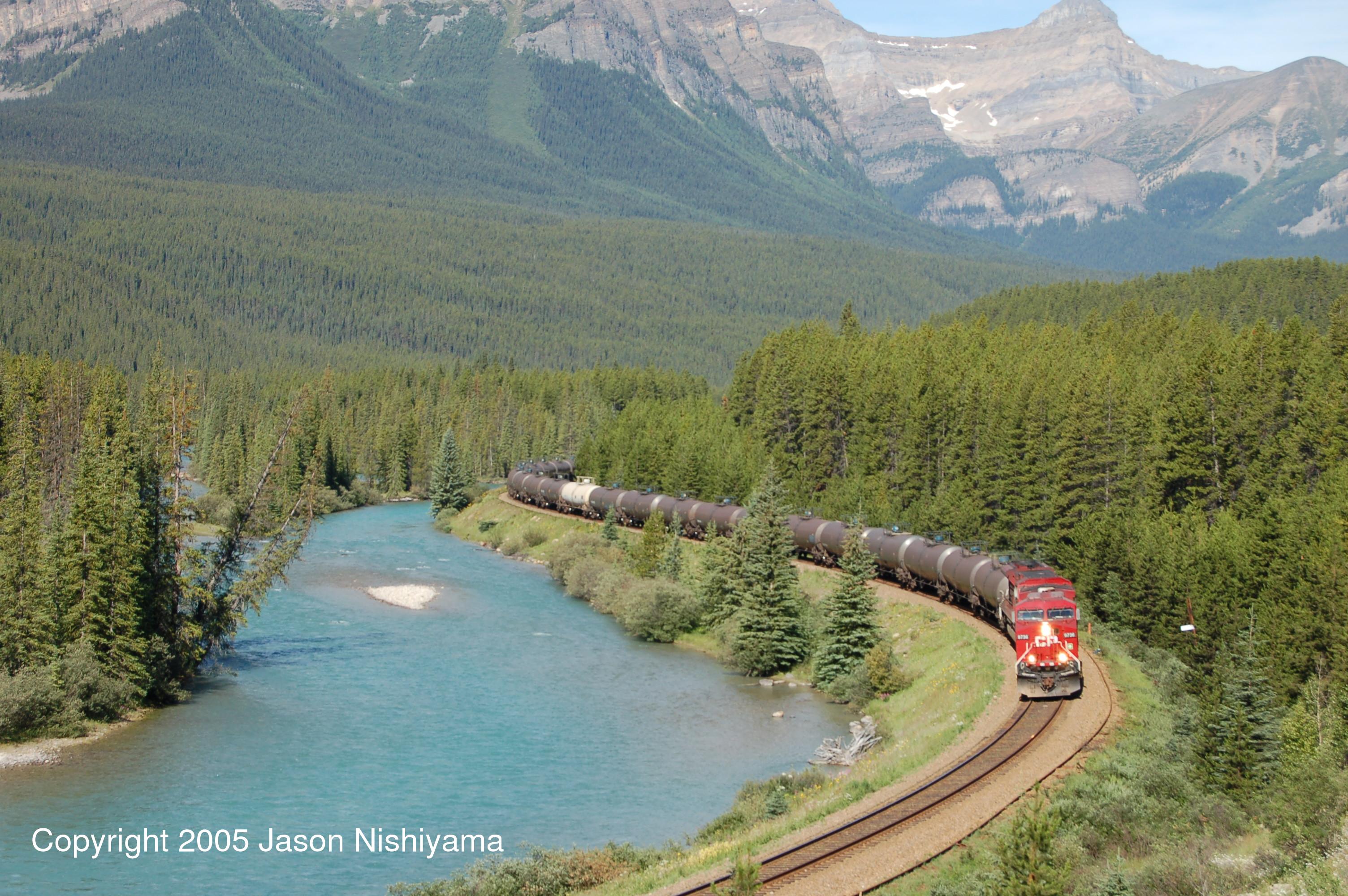 CP AC4400 locomotive 9736 pulls a train of tank cars through Morant's Curve on a sunny July day in 2005.