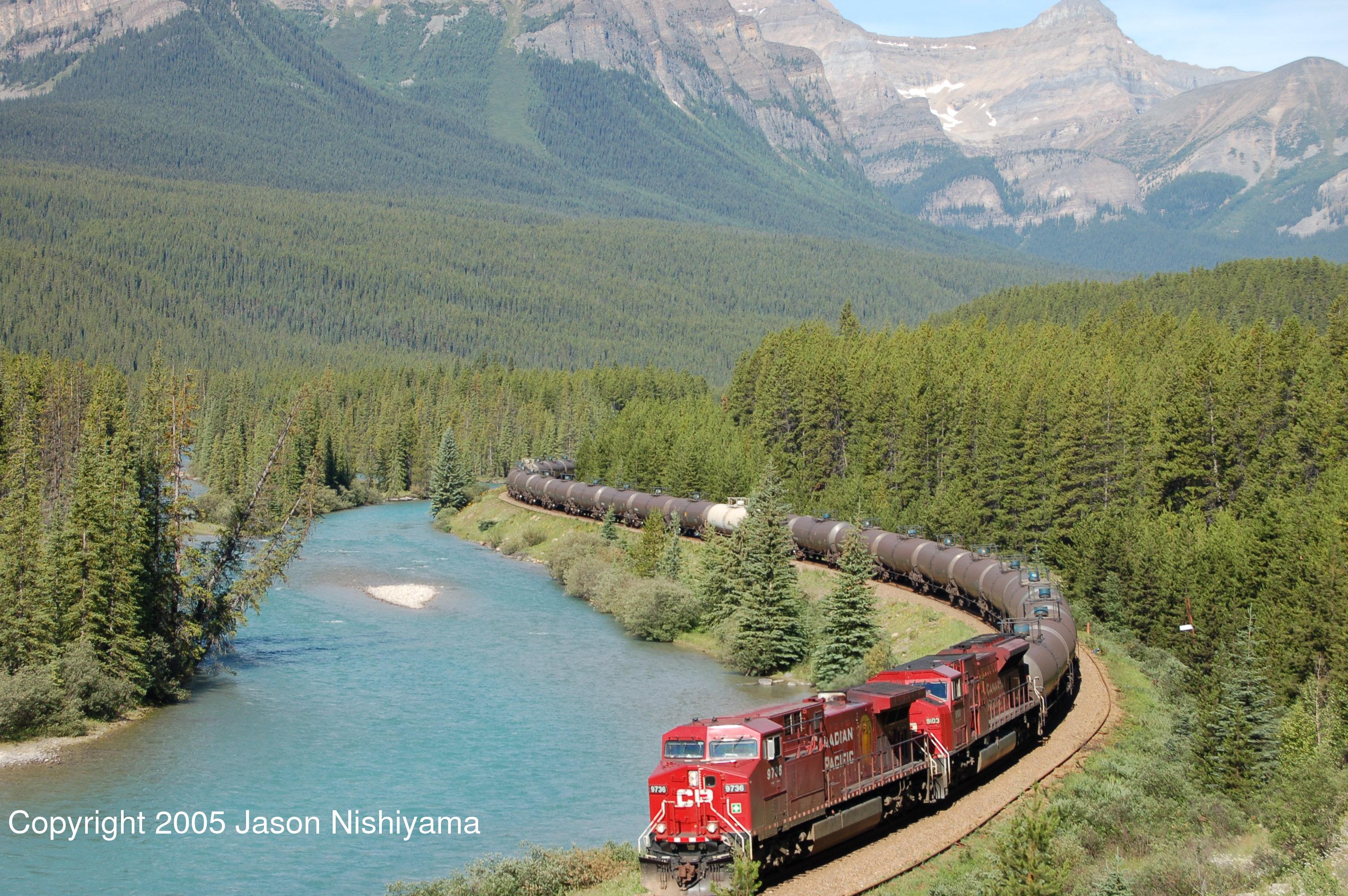 CP AC4400 number 9736 pulls a train of tank cars through Morant's Curve
