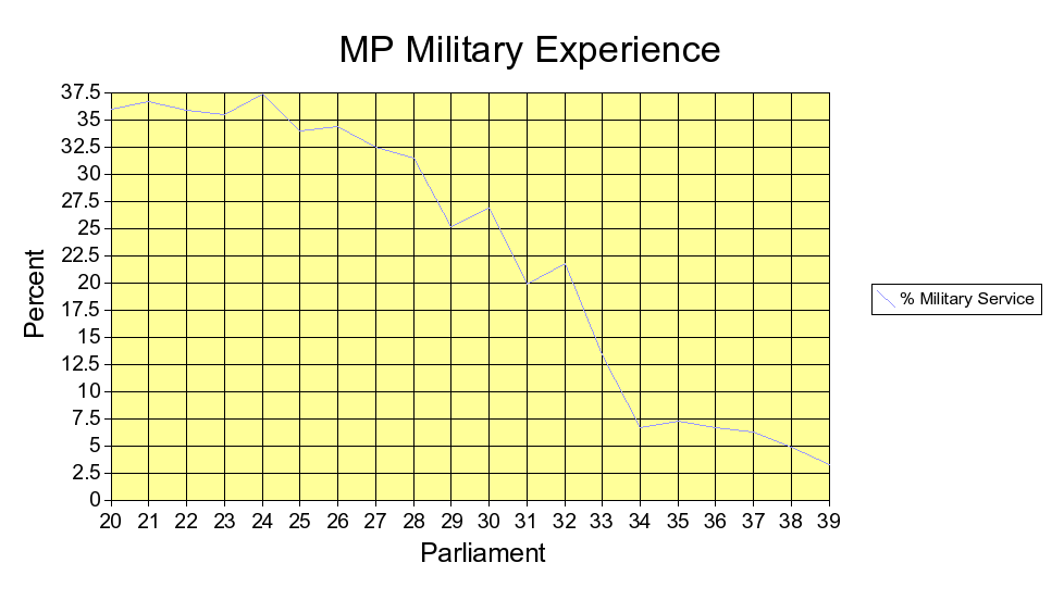 Full size version of chart of percentages of Members of Parliament since WWII with military experience.