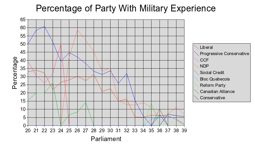 Full sized chart comparing what percentage of various Canadian political parties' MP's have military experience since 1945.